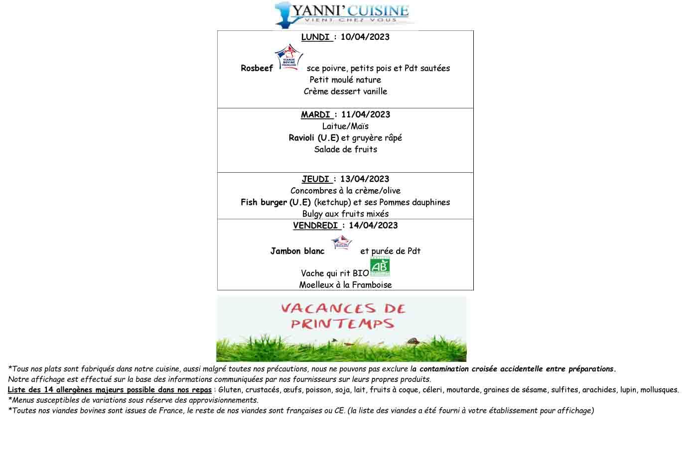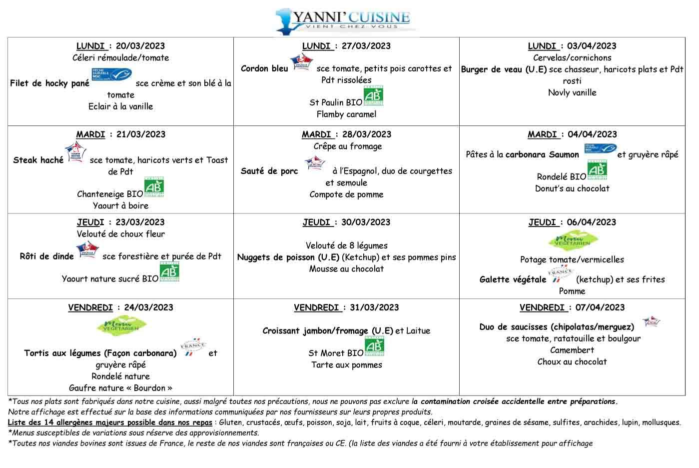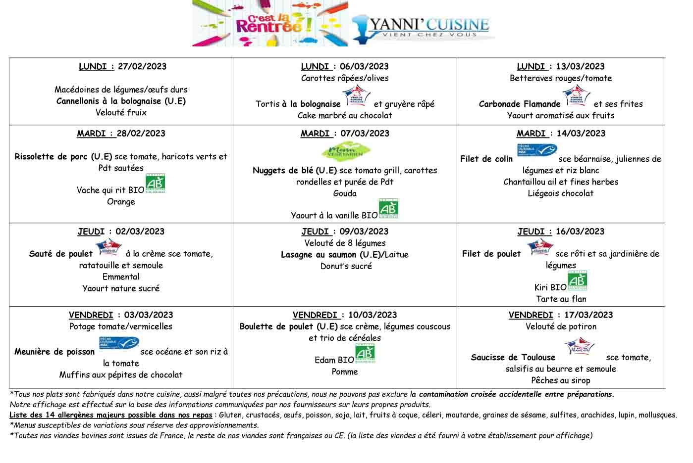 Les menus de la cantine scolaire